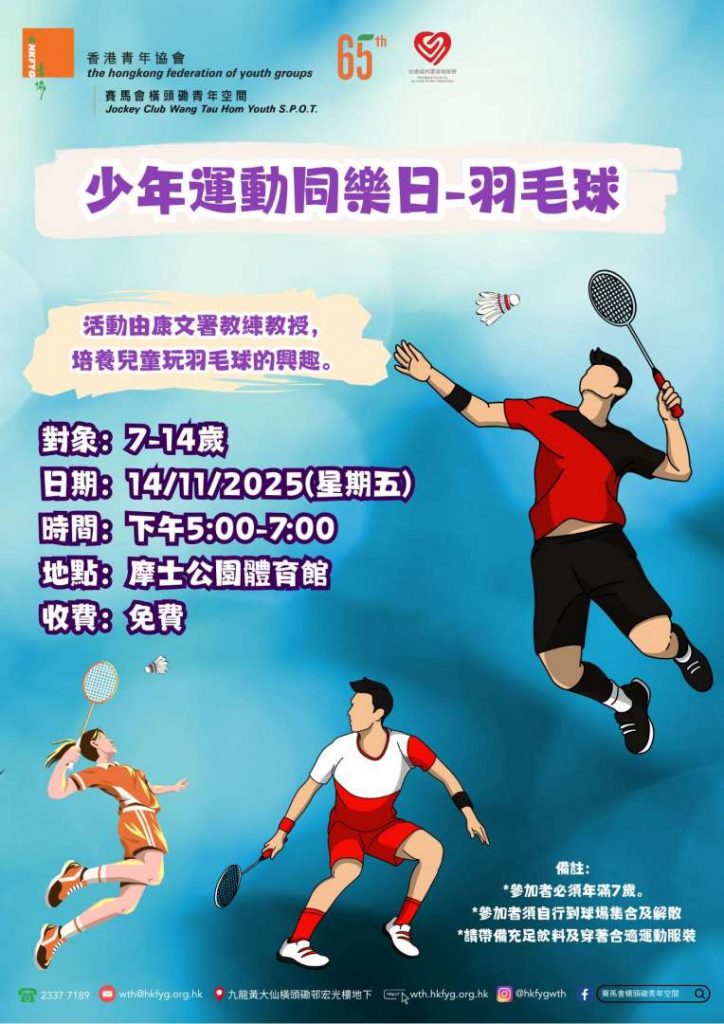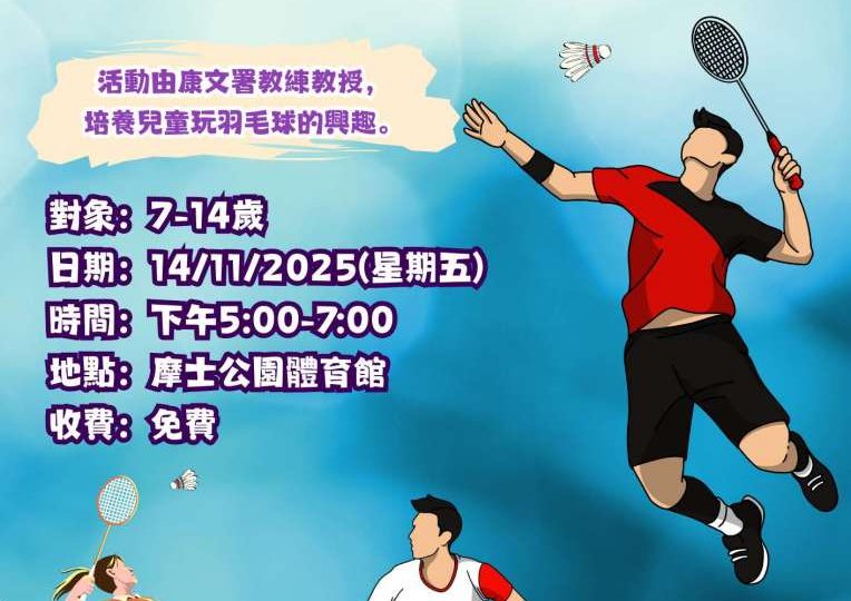 活動:少年運動同樂日2025-羽毛球 簡介:活動由康文署教練教授,培養兒童玩羽毛球的興趣。 對象:7-14歲 日期:14/11/2025(星期五) 時間:5:00-7:00pm 地點: 摩士公園體育館 […]