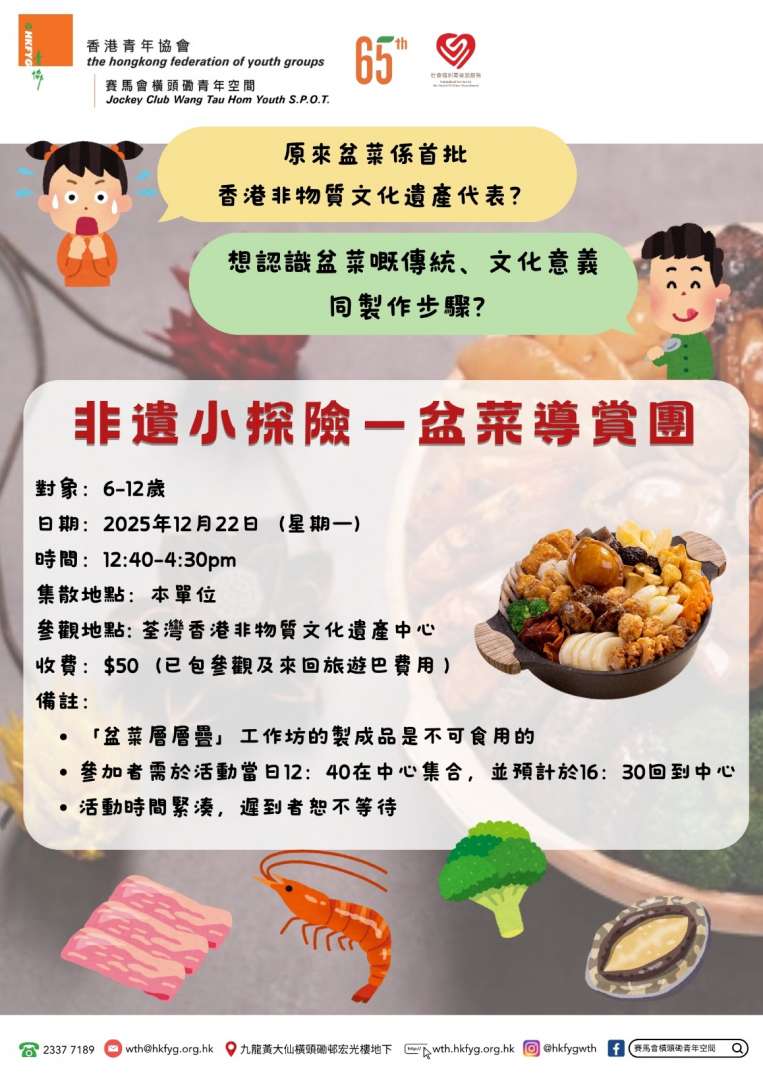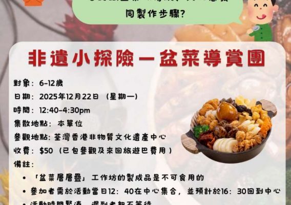 簡介:盆菜是象徵著家庭團圓和豐盛的傳統的中式佳餚,不少家庭在慶祝冬至的時候享用。原來,盆菜亦是首批香港非物質文化遺產代表,參加者可透過參與盆菜工作坊和展覽導賞,認識其傳統、文化意義,以及製作步驟,體驗設計及組合自己喜歡的盆菜(不可食用),增加對傳統文化的認識。