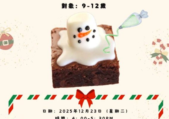 活動:(高小組)聖誕狂想cook—雪人造型布朗尼 簡介:聖誕節快到了!今年不只是收禮物,小朋友將化身小廚師親手做出應節 美食,將製成品分享給家人和朋友,享受烹飪的樂趣,並在歡樂氣氛中建立自信與成就感。 對象:9-12歲 日期:2025年12月23日(星期二) 時間:4:00-5:30pm 集散地點:本單位 UKitchen 收費:$100 備註: – 參加者需自備圍裙和食物盒 – 如有食物敏感,請盡早通知職員